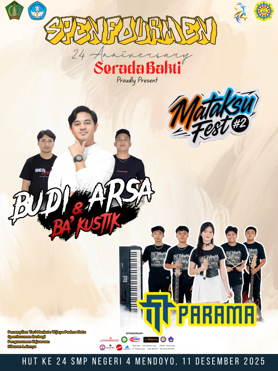 Filosofi Logo HUT ke-24 SMP Negeri 4 Mendoyo: Logo ini menampilkan burung Jalak Bali yang membentuk angka 2, dengan angka 4 sebagai tempat bertenggernya. Bentuk ini tidak hanya memiliki nilai estetika, tetapi juga menggambarkan perjalanan, identitas, dan arah pengembangan sekolah. Wujud Jalak Bali yang menyerupai angka 2 menggambarkan karakter luhur dan kearifan budaya Bali yang menjadi dasar pembentukan sikap warga sekolah. Burung ini melambangkan keanggunan, kecermatan, dan ketenangan dalam menghadapi perubahan. Sebagai satwa yang dilindungi, Jalak Bali juga menjadi simbol pelestarian dan harapan, mencerminkan tekad untuk menjaga nilai-nilai baik sambil terus tumbuh dan berkembang. Angka 4 menjadi simbol pondasi pendidikan yang kuat, membentuk karakter, pengetahuan, kreativitas, dan kepedulian sosial siswa. Angka 4 yang kokoh menunjukkan stabilitas dan arah yang jelas, menegaskan bahwa sekolah adalah ruang pembinaan yang aman untuk tumbuh dan belajar. Posisi burung yang sedang bertengger menunjukkan hubungan harmonis antara sekolah sebagai pondasi dan siswa sebagai generasi penerus. Gradasi warna emas melambangkan keluhuran, martabat, dan pencapaian bernilai tinggi dalam proses pendidikan. Biru menyala menggambarkan kejernihan berpikir, kecerdasan, dan semangat untuk terus berkembang menghadapi masa depan. Sentuhan warna ungu pada ujung ekor memberikan kesan mendalam, anggun, dan spiritual — melambangkan kedewasaan emosional, kebijaksanaan, serta kemampuan menghargai perbedaan. Perpaduan ketiga warna ini menggambarkan perjalanan siswa yang dimulai dari karakter dan nilai luhur (emas), berkembang menjadi pribadi cerdas dan berwawasan luas (biru), lalu berproses hingga menjadi individu yang dewasa secara emosional dan sosial (ungu). Gradasi warna ini mempertegas gagasan tumbuh, berubah, dan bertransformasi menjadi versi diri yang lebih baik dari waktu ke waktu. Secara keseluruhan, logo ini menjadi pengingat bahwa perjalanan menuju masa depan harus selalu bertumpu pada jati diri, karakter, dan nilai kebudayaan yang luhur. HUT ke-24 dipandang sebagai momentum untuk memperkuat identitas sekolah, meningkatkan kualitas pendidikan, serta menumbuhkan prestasi yang membanggakan.